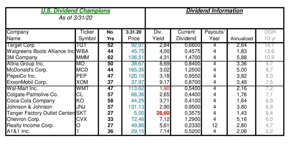 Ще одним плюсом інвестування в дивіденди є стабільність виплат з їхнім щорічним підвищенням протягом низки десятиліть (колонка "Nr Yrs").