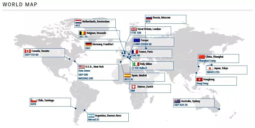 На карті показано основні світові індекси акцій.