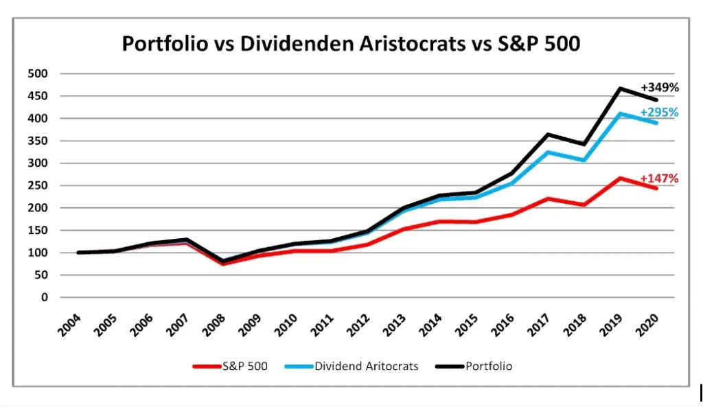 - За той самий період 100$, інвестовані в портфоліо, що складається тільки з дивідендних аристократів Америки, зросли до 395$. Це становить +295% на інвестовану суму, або по 19,6% щорічного зростання (синя крива).