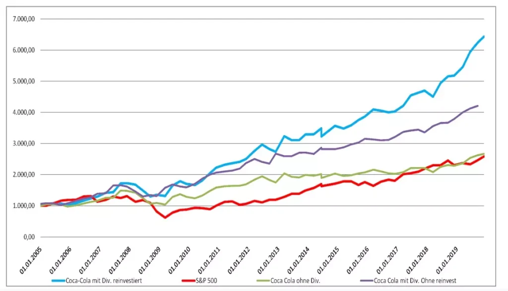 У випадку з Coca-Cola, навіть якщо уявити, що компанія не виплатила за цей період жодного долара дивідендів, результат (зелена лінія) однаково перевищив результат S&P 500-індексу і становив 2667$. Це 266%, або 19% на рік.