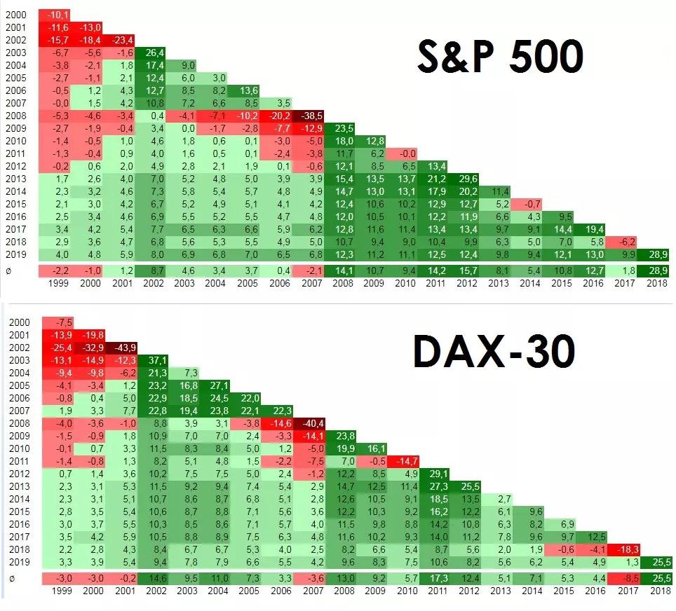 А ті, хто інвестував у Dax наприкінці 2008 року і знову продав їх наприкінці 2018 року, домоглися середньорічної прибутковості 8,2%. Однак у разі виходу в 2019 році розраховується річна прибутковість у розмірі 9,6%.