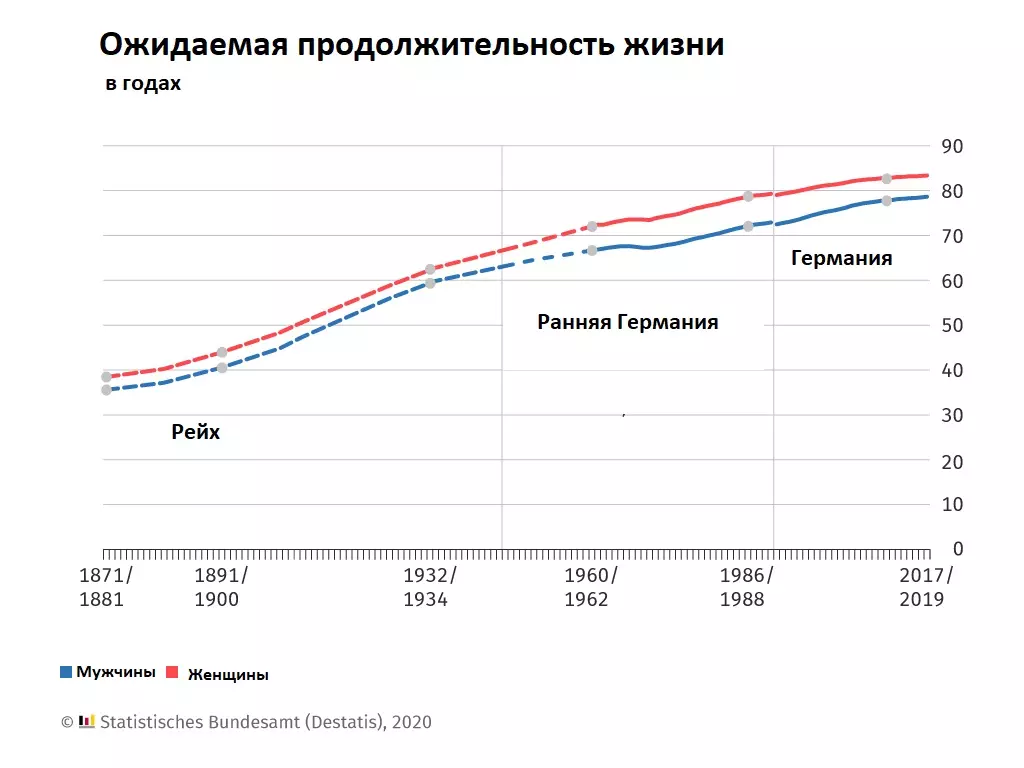 WIESBADEN - Наразі середня тривалість життя становить 83,4 року для новонароджених дівчаток і 78,6 року для новонароджених хлопчиків. Як повідомило Федеральне статистичне управління (Destatis), очікувана тривалість життя в Німеччині для дівчаток і хлопчиків збільшилася приблизно на 0,1 року порівняно з останнім розрахунком (за період з 2016 по 2018 рік).