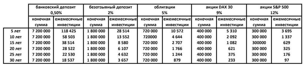 - якщо ми інвестуватимемо в S&P 500, то для того щоб отримати кінцеву суму, що дорівнює 300 000 євро, необхідно щомісяця інвестувати приблизно 325 євро. Повторюємо ті самі розрахунки для облігацій, вони статистично здатні приносити 5 відсотків, для банківського безвідкличного депозиту, у нього 2 відсотки і для звичайного банківського депозиту, при 0,5 відсотка. Обом банківським депозитам ми авансом дали 2 і 0,5 відсотків, хоча знаємо, що останні роки банківські депозити не дають своїм інвесторам взагалі жодних відсотків. Однак 30 років термін не малий і ситуація рано чи пізно зміниться. Отримані результати заносимо в таблицю. Усе, "дорожня карта" готова, можна аналізувати й робити висновки.