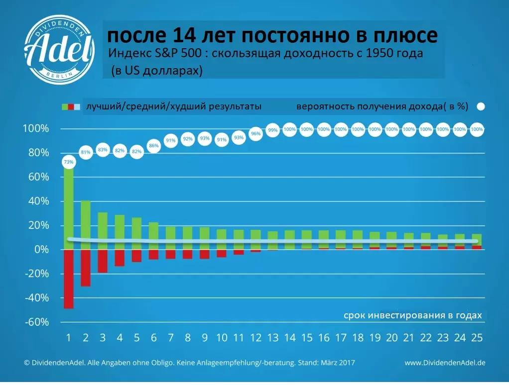 Графік показує ймовірність отримання позитивного результату при інвестуванні в індекс S&P 500, залежно від тривалості інвестування.Так наприклад: якщо термін інвестування один рік, то ймовірність отримання прибутку дорівнює 73-м відсоткам, а історично максимальний річний прибуток становив 79 відсотків.Відповідно, історично максимальний річний збиток становив 48 відсотків.